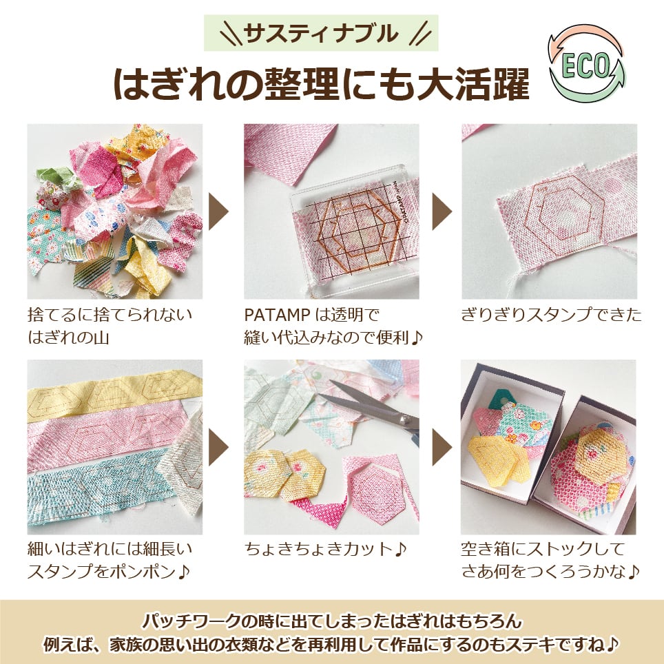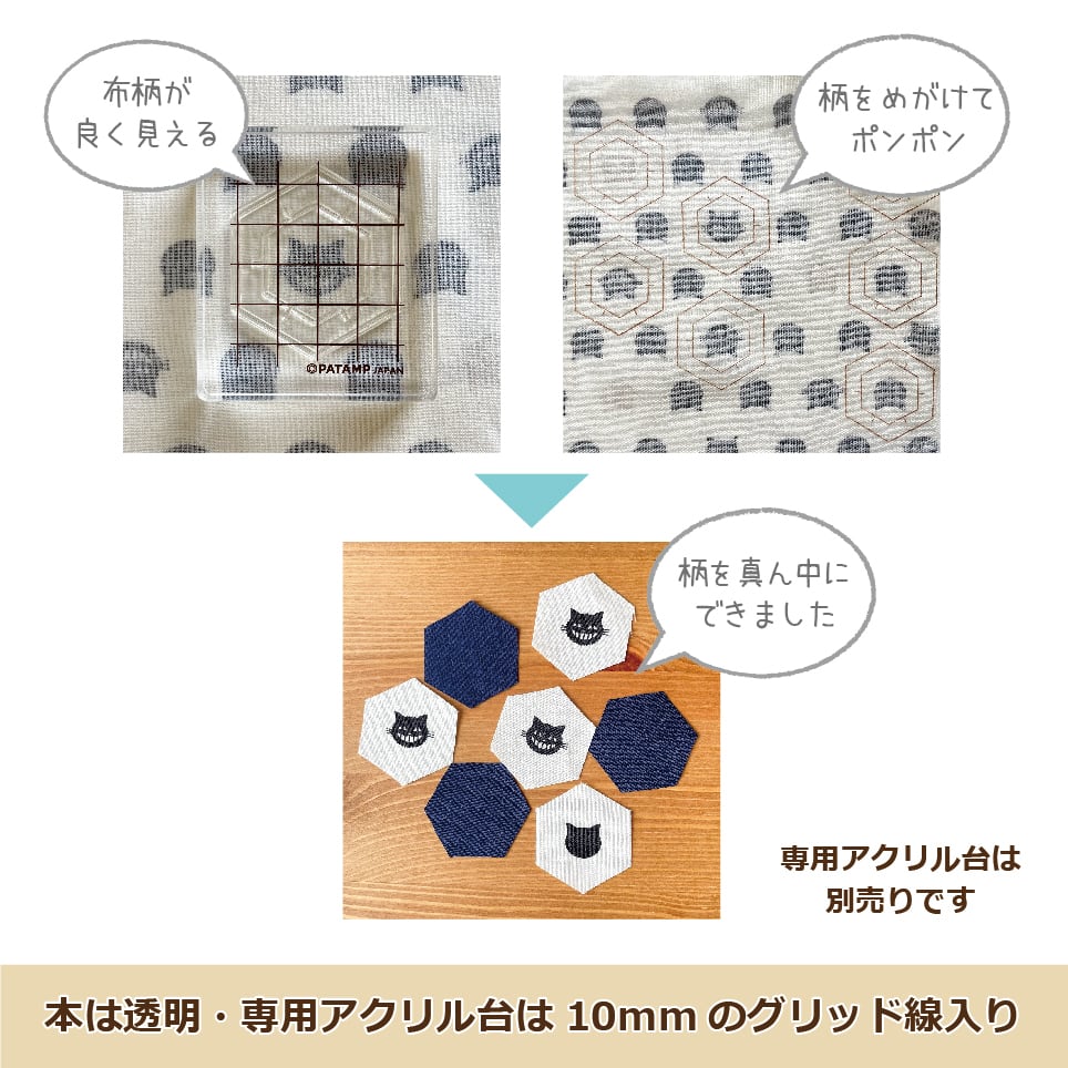 専用のインクをつけて布の裏にポン!とスタンプするだけで、面倒なパッチワークの印付けが完了♪