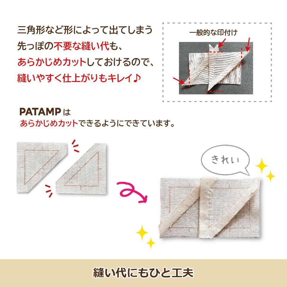 専用のインクをつけて布の裏にポン!とスタンプするだけで、面倒なパッチワークの印付けが完了♪