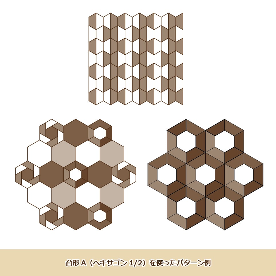 同じ形・サイズのみで作るワンパッチキルトだけでなく、パッチワークパターンの広がり・組み合わせをお楽しみいただけます。